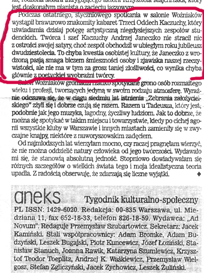 ...Nie kwestionowanym zwyciêzc± konkursu zosta³ reprezentuj±cy ¶rodowisko bia³ostockie Andrzej Janeczko z zespo³em "Trzeci Oddech Kaczuchy". Estradowa bezpretensjonalno¶æ, ciete teksty (m.in.znakomity "Wódz") atrakcyjne u¿ycie muzyki (m.in.efektów onomatopeicznych) - nagrodzono Grand Prix, przyznanym zreszt± po wieloletniej posusze..."